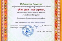 Педагоги нашего детского сада : ст.воспитатель Ермакова Н.А., воспитатели Ларина Г.И., Петрова С.А. приняли участие во Всероссийском конкурсе краеведческих работ "Мой край-моя страна", посвященном 95-летнему юбилею республики Татарстан, и стали победителями в номинациях "Сценарий мероприятия", "Краеведческая фотография", ""Литературное произведение". Поздравляем!!!
