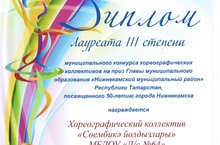 Хореографический коллектив "Сәйлән" под руководством Габдуллиной Э.Г.выступили в номинации "Хореография" с танцем "Сабантуй бизәкләре", и получили Диплом III степени. Поздравляем!