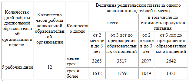 На основании Постановления исполнительного комитета Нижнекамского муниципального района Республики Татарстан от 16.11.2021 №953 "Об утверждении размера родительской платы за присмотр и уход за детьми в дошкольных образовательных учреждениях Нижнекамского муниципального района Республики Татарстан на 2022 год" с 01.01.2022 год размер родтельской платы составит:
