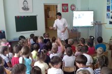 Для старших подготовительных групп была организована встреча со специалистами Центра медицинской профилактики. С помощью мультфильмов детям были даны понятия о соблюдении правил личной гигиены. Дошкольникам продемонистрировали как правильно чистить зубы, с помощью ИКТ разбирались ситуации по культуре поведения. Дети с удовольствием общались и получили для себя полезную информацию.