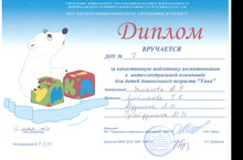 В течении последних месяцев в детских садах проводилась интеллектуальная олимпиада для детей дошкольного возраста "УМКА", совместно с МБОУ ДОД "Центр внешкольной работы" для одаренных детей НМР РТ. По результатам протоколов нужно отметить следующих воспитанников: Нурова Самира-абсолютный победитель, Артиков Арсен-победитель, Гатауллин Амир-победитель, Мифтахова Аделя-победитель, Сайфуллина Алина-победитель.