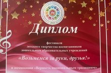 26 мая Прошел фестиваль детского творчества «Возьмемся за руки друзья» в гала-концерте воспитанники старших групп в количестве 25 человек выступили с хореографической композицией «Красно солнышко». Результат : Диплом в номинации «За преданность традициям.»