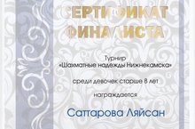 27 апреля 2016г. на базе СОШ № 15 прошел финал и награждение по шахматному турниру среди дошкольников. В финал прошла воспитанница подготовительной к школе группы № 5 Саттарова Ляйсан, которая была награждена сертификатом финалиста и памятными подарками. Молодец!!!