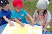 Лето – самая любимая пора всех детей, ведь в теплую погоду можно практически целый день проводить на свежем воздухе, вдоволь гулять, веселится, играть, бегать и прыгать. Солнце греет своими лучами.Воспитанники 8 группы решили оформить солнышко своими маленькими ладошками. Вы только посмотрите, какая красота получилась!