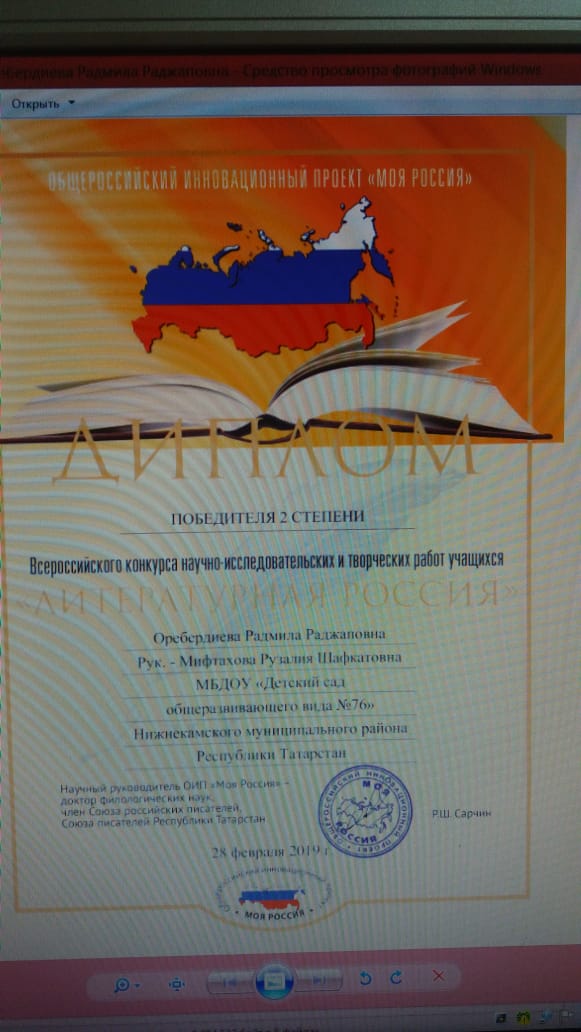 28. 02. 2019 года воспитанники нашего сада приняли участие во Всероссийском конкурсе научно-исследовательских и творческих работ учащихся, и были награждены дипломом победителя I степени- Хазиахметов Булат Фаритович, и Дипломом победителя II степени - Нуриева Азалия Наилевна, Оребердиева Радмила Раджаповна, Амирова Миляуша Ильдаровна. Поздравляем!!! Желаем дальнейших творческих успехов и побед!
