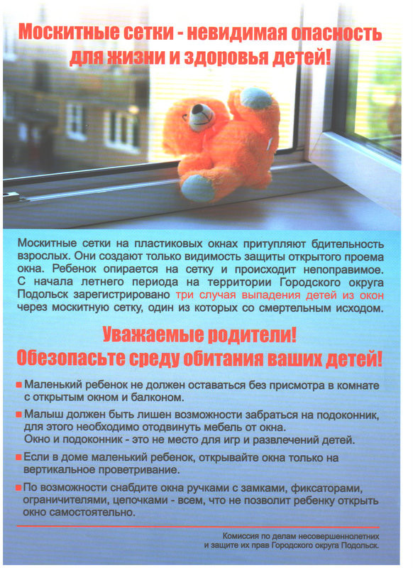 Никогда нельзя рассчитывать на защиту с помощью москитной сетки. Даже самые качественные фирменные сетки не предназначены для того, чтобы выдерживать напор и вес ребенка. Очень часто дети выпадают вместе с москитными сетками.