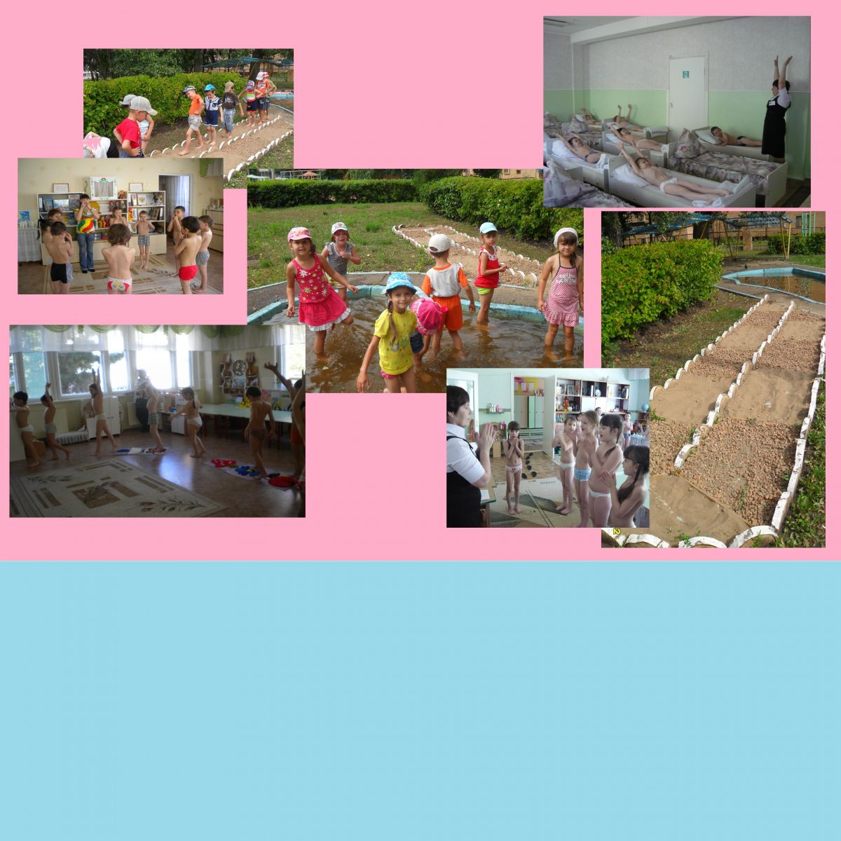 Работа строится на основе Программы «Будь здоров, малыш!», разработанная коллективом детского сада на пять лет, целью которой являются оздоровление детей, повышение качества медико-социальных условий развития каждого малыша. В своей работе коллектив нашего детского сада применяет адаптированный вариант методик спецзакаливания детей А. Уманской и К. Динейки.