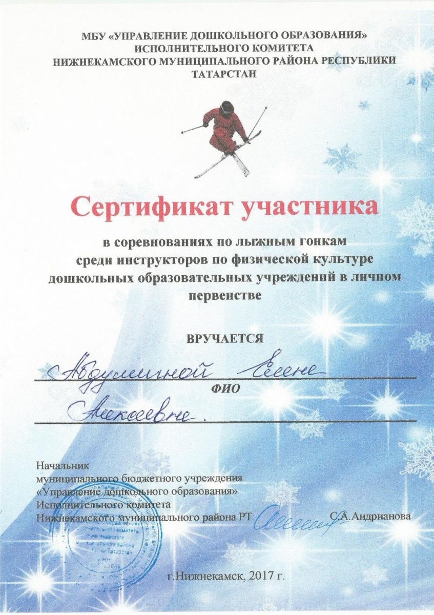 Опубликовано: 22.12.2017С целью популяризации и развития лыжного спорта среди работников дошкольных учреждений на базе лагеря "Алмаш" были организованы лыжные гонки. В данном мероприятии участвовала и наша Абдуллина Елена Алексеевна и заняла 4 место! Молодец!