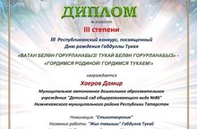 Воспитанник 9 группы Хаеров Дамир участвовал в Республиканском конкурсе, посвящённый Дню рождения Габдуллы Тукая "Ватан белән горурланабыз! Тукай белән горурланабыз!" и награжден Дипломом 3 степени в номинации "Стихотворение". Поздравляем с победой!