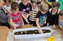 Зурлар төркемендә тәрбияләнүче балалар тәрбияче апалары белән берлектә суган утырту белән шөгыльләнделәр. Алар бу эшне бик теләп һәм кызыксынып башкардылар.