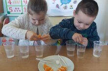 6 нчы төркемгә йөрүче балалар төрле тәҗрибәләр үткәрергә бик яраталар. Су белән тәҗрибәләр үткәрү барышында, балалар, суның үзлекләре белән танышуны дәвам иттеләр. -