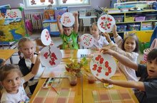 Сегодня они рисовали веточку рябины, с помощью крышечек от пластиковых бутылок. -