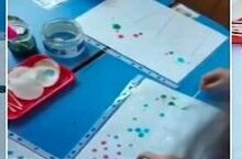 Рисуем на листе бумаги несколько стаканчиков и помещаем его в файл. Наносим на салфетку немного растительного масла и протираем ей поверхность файла. Разводим в трех стаканах синий, красный и желтый красители, либо краску. Оставляем большие разноцветные капли по всему листу с помощью пипетки. Даём ребёнку ватную палочку и просим собрать капли в нарисованные стаканчики, смешивая их при необходимости. Прикасаемся кончиком к капле и тянем ее в нужное место.