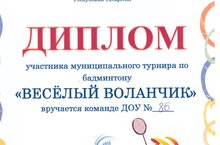 Сегодня на базе МБОУ "Гимназия №22" НМР РТ состоялся турнир по бадминтону "Весёлый воланчик" среди воспитанников дошкольных образовательных учреждений. Турнир проводился с целью популяризации и развития бадминтона среди детей дошкольного возраста. От нашего детского сада приняли участие воспитанники подготовительной к школе группы Козлова Виктория и Шайдуллин Инсаф и награждены дипломом участника. Поздравляем!
