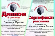 Сәлимов Солтан (тәрбияче Газизянова Э.С.) һәм Кәлимуллина Зәлия (тәрбияче Зиганшина И.М.) К.И.Чуковский әсәрләре буенча оештырылган рәсем бәйгесендә катнашып 2 нче дәрәҗә Диплом һәм катнашучы сертификатына ия булдылар.