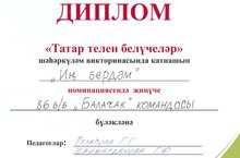 Бүген, 6 нчы апрельдә Түбән Кама шәһәренең 74 нче балалар бакчасында "Татар телен белүчеләр" шәһәркүләм викторинасы узды. Бәйгенең максаты: татар телен, татар мәдәниятен саклау һәм үстерү, туган телне өйрәнү һәм камилләштерү өчен шартлар тудыру. Әлеге викторинада безнең балалар бакчасының "Балачак" командасы катнашты һәм "Иң бердәм" номинациясендә Диплом белән бүләкләнделәр. Җитәкчеләре: Рязапова Г.Г., Шаймарданова Г.Ф.