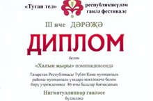 В республиканском семейном фестивале "Туган тел", организованном в детском саду № 83 г. Нижнекамска, из нашего детского сада приняла участие семья Нигматуллиных и удостоены Диплома 3 степени в номинации "Народная песня". Цель фестиваля - конкурса: поддержка и развитие традиций семейного творчества, укрепление детско - родительских отношений на основе общих интересов и увлечений.