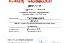 Воспитанница Нигматуллина Амина приняла участие в республиканском фестивале - конкурсе татарского искусства "Моң чишмәсе", который проходил в городе Набережные Челны. Амина исполнила татарскую народную песню "Яшә син, туган илем" и награждена Дипломом лауреата III степени в номинации "Вокальное исполнительство. Народное пение". Поздравляем!