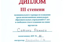 Сегодня на базе ДОУ №87 прошёл муниципальный турнир по плаванию среди дошкольников НМР РТ. Соревновались воспитанники 5-6 лет и 6-7 лет, заплывами вольным стилем на груди и на спине. Воспитанник нашего детского сада Сафин Рамис награжден Дипломом 3 степени в свободном стиле плавания на спине. Остальные участники турнира награждены дипломами участника. Поздравляем! Инструктор: Хасанова Г.Д.