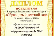 Наш детский сад участвовал во Всероссийском смотре - конкурсе "Образцовый детский сад". Конкурс проходил с 30 января по 15 марта 2018 года. По итогам голосования мы получили медаль и Диплом Победителя.