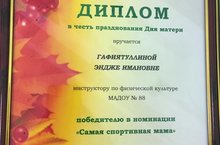 В честь празднования Дня матери, инструктор по физической культуре Гафиятуллина Эндже Имановна была награждена дипломом в номинации "Самая спортивная мама". Поздравляем!