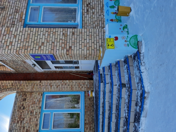 1) Вход. Доступ лиц с нарушением опорно-двигательного аппарата осуществляется через вход, оборудованный пандусами на первый этаж здания. При входе имеется табличка, выполненная плоско-выпуклым шрифтом Брайля с наименованием ДОУ, установлена «Кнопка вызова для инвалидов и лиц с ограниченными возможностями здоровья», которая обеспечивает вызов дежурного вахтера для связи с администрацией. Фотография