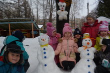 Смртр построек из снега на участках детсого сада. В оформлении участков воспитатели подошли тврочески.