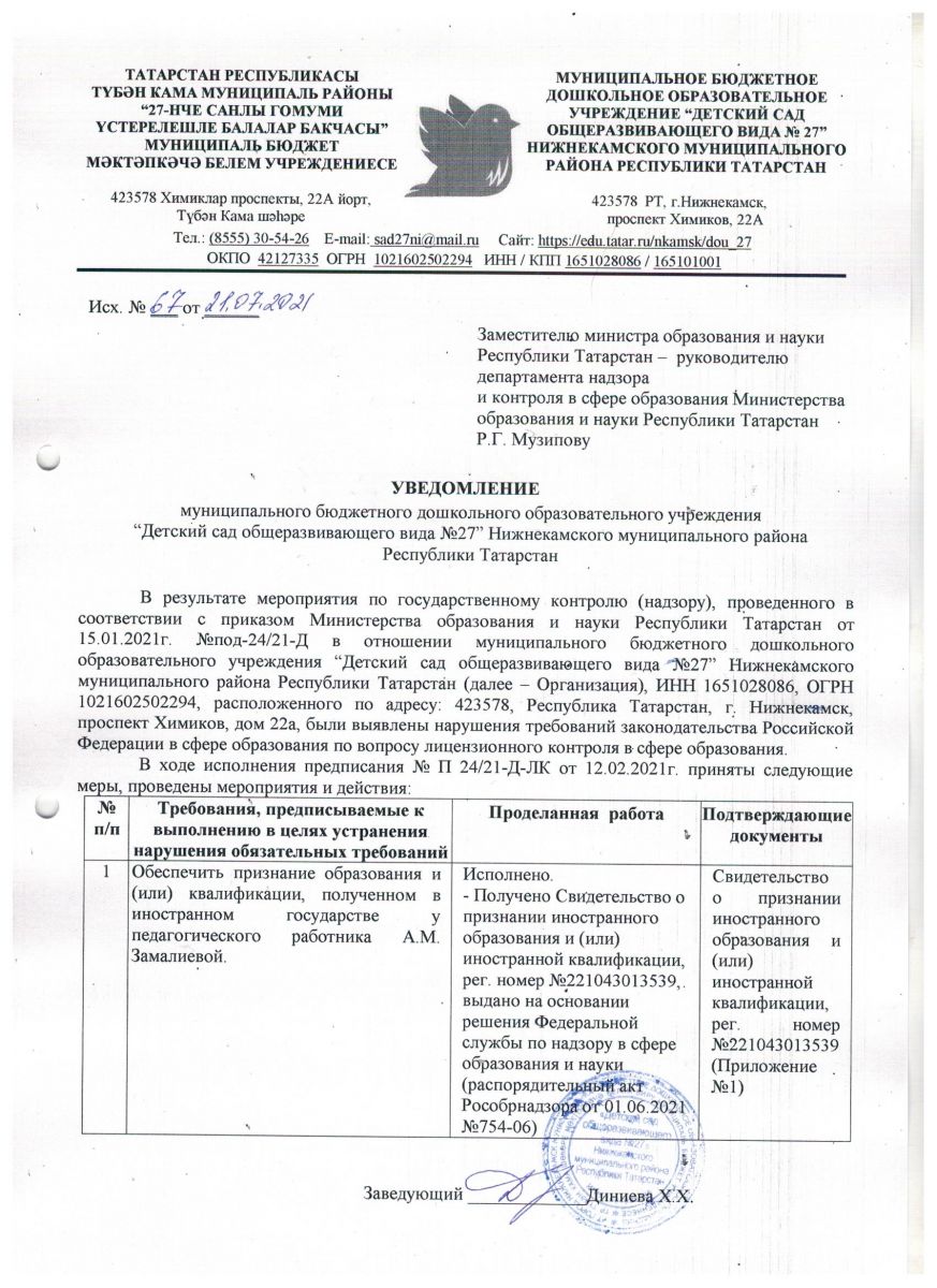 Предписание органов, осуществляющих государственный контроль (надзор) в сфере образования, отчёты об исполнении