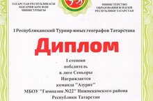 26-27 ноября 2016 года прошел I Республиканский Турнир юных географов Татарстана, в котором приняла участие команда нашей гимназии "Азурит". В составе команды выступили Касымов Раиль (11А), Толстиков Антон (10А), Шарипова Динара (9Б), Ситдиков Булат (9Б), Сухов Алексей (11А). Мы поздравляем команду "Азурит" с победой! Наши ребята заняли 1 место! Мы гордимся вами! Отдельное поздравление и благодарность учителю географии Латыповой Лилие Захраровне за вклад в победу!