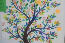 Все желающие писали на стикерах (листочках) пожелания и слова благодарности любимому учителю, гимназии и приклеивали их на дереве желаний. -