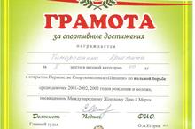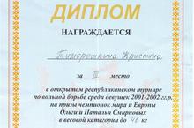 И снова наша юная спортсменка Кристина Тиморошкина 10 марта 2013 года участвовала и заняла 2 место в Открытом Первенстве спорткомплекса «Шинник» по вольной борьбе среди девочек, посвященном Международному Женскому дню 8 марта . Кристину наградили Грамотой за спортивные достижения. Кристина - наше юное дарование. Рады успехам нашей воспитанницы.