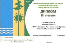 13 сентября были подведены итоги муниципального конкурса проектов благоустройства города «Город моего будущего», в котором приняли участие учащиеся 2 в класса Сафина Самира и Харитонов Никита. В этом конкурсе они заняли 3 место и награждены дипломами. Поздравляем ребят и их руководителя Мухаметьянову Чулпан Маликовну и желаем дальнейших успехов.