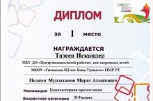 Поздравляем Тазеева Искандера с победой в Республиканском конкурсе технического творчества и современных технологий "ТехноФест-2020". Руководитель:Мурзаханов М.А.