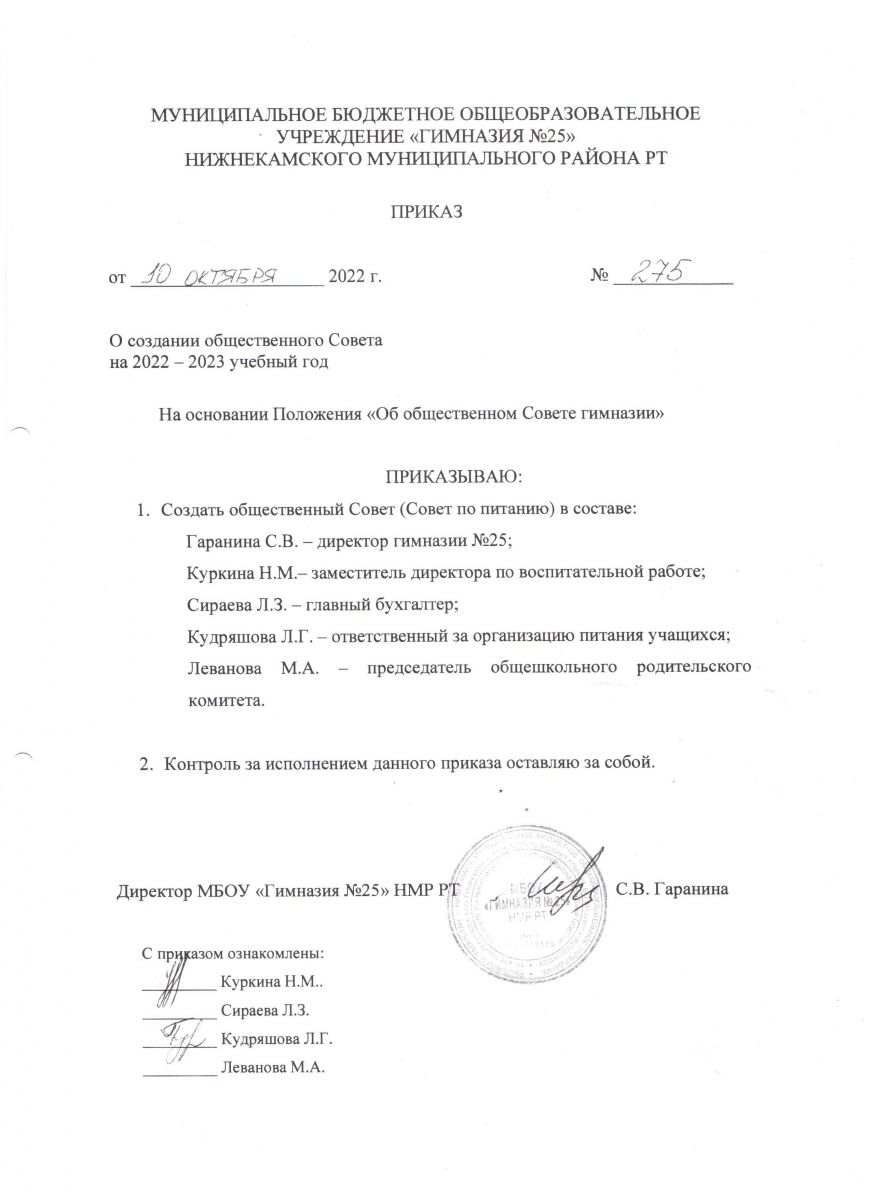 Приказ о создании Общественного совета (совета по питанию) 2022-2023