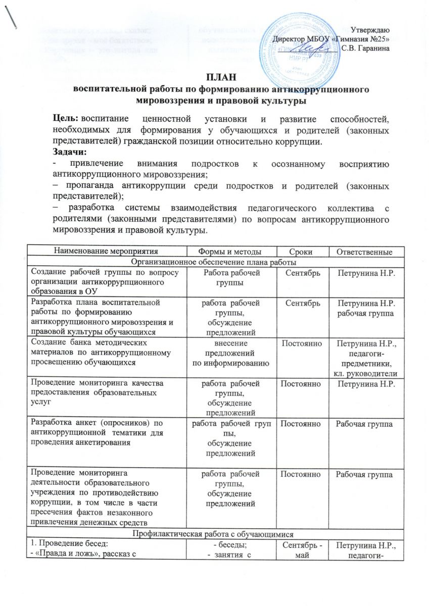 План воспитательной работы по формированию антикоррупционного мировоззрения и правовой культуры