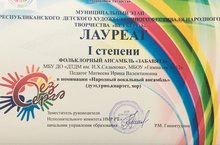 Поздравляем руководителя фольклорного ансамбля "Забавушка" Матвееву И.В. и ее воспитанников с высокими результатами муниципального этапа республиканского детского художественного фестиваля народного творчества "Без бергэ". Коллектив получил 2 диплома первой степени, 1 диплом второй степени и 1 диплом 3 степени. Молодцы!