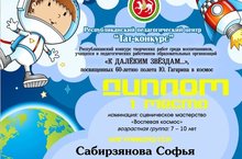 Поздравляем ученицу 1 А класса Сабирзянову Софью и кл. руководителя Сазонову Р.Ф. за победу в номинации "Сценическое мастерство" республиканского конкурса творческих работ "К далеким звездам...", посвященного 60-летию полета Ю.Гагарина в космос.