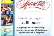 14 января 2018г. в спортивном зале "Факел" состоялся муниципальный турнир по настольному теннису на призы Деда Мороза. Сабанова Александра, ученица 8 а класса заняла третье почетное место из 70 учащихся школ города. Поздравляем Александру и педагога Голованову Э.М.
