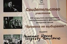 15 мая во Дворце творчества детей и молодежи им. И.Х. Садыкова состоялся ХVI открытый республиканский молодежный фестиваль бардовской песни «Времена не выбирают», в котором приняла участие ученица 10 А класса нашей гимназии – Романько Ирина.