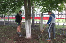 Сегодня ребята ударно поработали! Учащиеся 8а класса окопали 38 деревьев вокруг гимназии, а учащиеся 5б класса занимались уборкой территории. После работы ребята играли в футбол. Команда 5б класса победила со счетом 3:2.