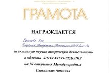 23 апреля 2015 года в МБОУ «СОШ №132 им.Героя Советского Союза Губанова Г.П.» города Самары прошли XI Международные Славянские чтения, в которых успешно приняла участие ученица 6В класса Ефимова Яна с исследовательской работой «Мифологические и фольклорные образы в прологе к поэме А.С.Пушкина «Руслан и Людмила», руководители – Клипова Наталья Александровна и Ефимова Светлана Валерьевна, учителя русского языка и литературы, получив грамоту «За активную научно-творческую деятельность в области литературоведения».