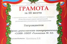 В декабре 2014 года детская общественная организация МБОУ «Гимназия № 32», школьный Совет старшеклассников «САМИ», приняла участие в муниципальном этапе I Всероссийского конкурса общеобразовательных организаций, развивающих ученическое самоуправление.