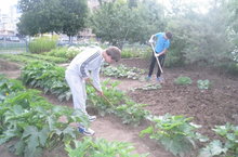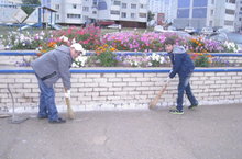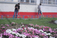 Весь участок школьного двора – один сплошной газон разнотравий, который служит прекрасным фоном для цветочных клумб, деревьев и декоративных кустарников. Не случайно, школьники заняты благоустройством территории. -