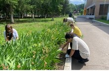 Ученики 6 класса пропалывают палисадник и поливают цветы