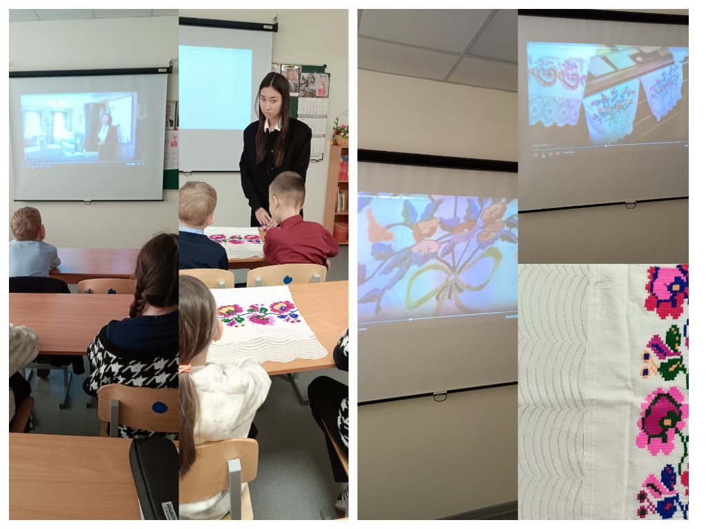 11 сыйныф укучысы Григорьева Даниэла әбисе, Храмова Анна Григорьева, чиккән сөлге үрнәкләре турында сөйләде.