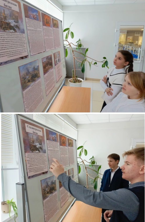 Советником директора по воспитанию был проведен классный час, посвященный Сталинградской битве, совместно с ШУС был изготовлен информационный стенд. -