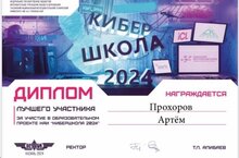 Ученик 11 класса Прохоров Артем был награжден Дипломом за участие в образовательном проекте КАИ «Кибершкола 2024»