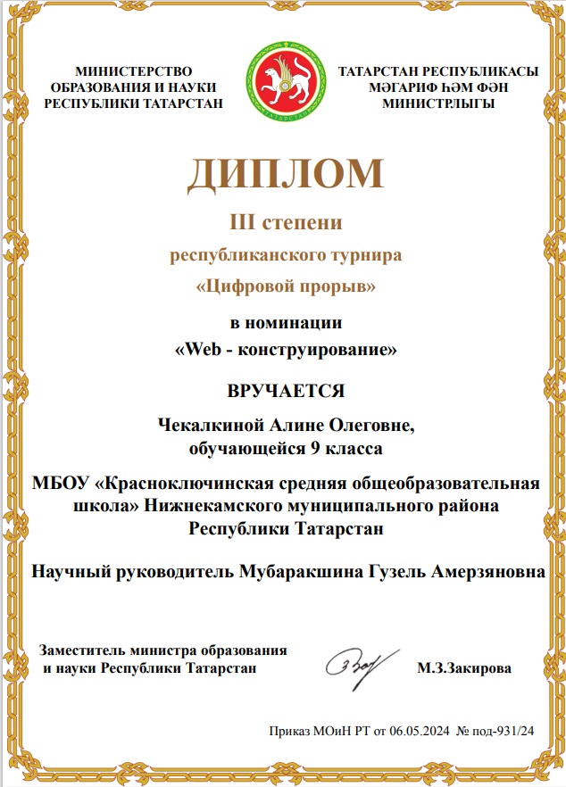 Республиканский турнир "Цифровой прорыв" проводился с целью повышения мотивации учащихся к получению и совершенствованию умений и навыков в области информационных технологий, содействия развитию интеллектуального творчества учащихся, привлечения их к исследовательской и проектной деятельности и посвящён Году научно-технологического развития в Республике Татарстан.В номинации «Web-конструирование» ученица 9 класса Чекалкина Алина заняла 3 место. (Педагог Мубаракшина Г.А)