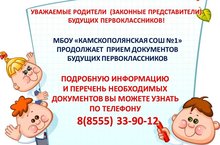 МБОУ «Камскополянская СОШ №1» НМР РТ продолжает прием документов будущих первоклассников. За подробной информацией можно обратиться по телефону 8(8555) 33-90-12