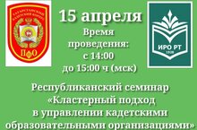 15 апреля 2022 года ГАОУ ДПО «Институт развития образования Республики Татарстан» совместно с ГБОУ «Татарстанский кадетский корпус Приволжского федерального округа имени Героя Советского Союза Гани Сафиуллина» проводит республиканский семинар «Кластерный подход в управлении кадетскими образовательными организациями» для руководителей и педагогов общеобразовательных организаций, образовательных организаций кадетских школ и школ-интернатов Республики Татарстан.